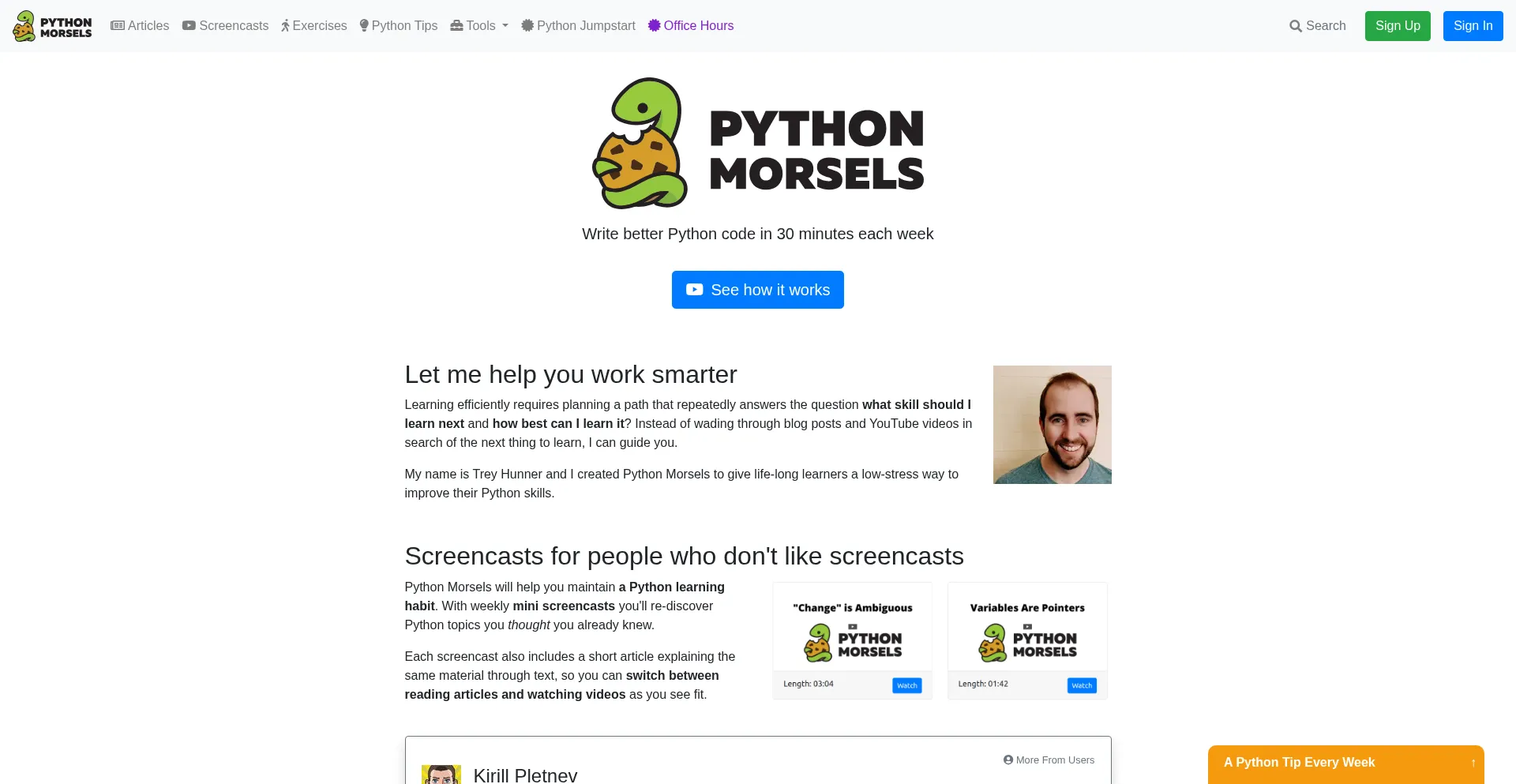 Adopt a more Pythonic coding style in 60 minutes of practice each week. Python Morsels includes exercises and screencasts by a professional Python trainer.