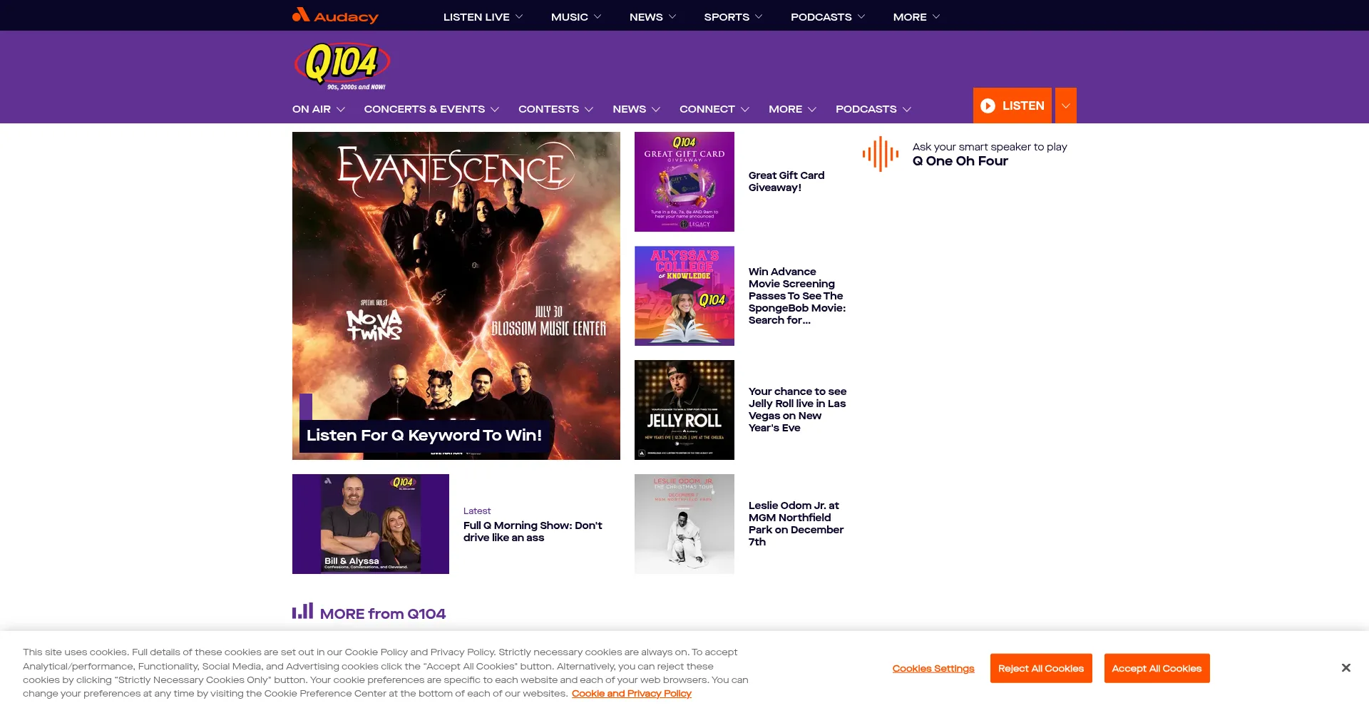 网站上存在社交媒体链接表明 q104.com 在社交媒体上维护官方账户,这是可信度和参与度的积极信号。