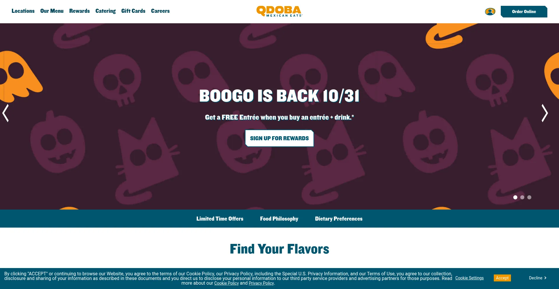 该网站实现符合GDPR或CCPA等隐私法规的cookie同意机制。这表明 qdoba.com 遵守数据保护标准并为用户提供对个人数据收集实践的控制。