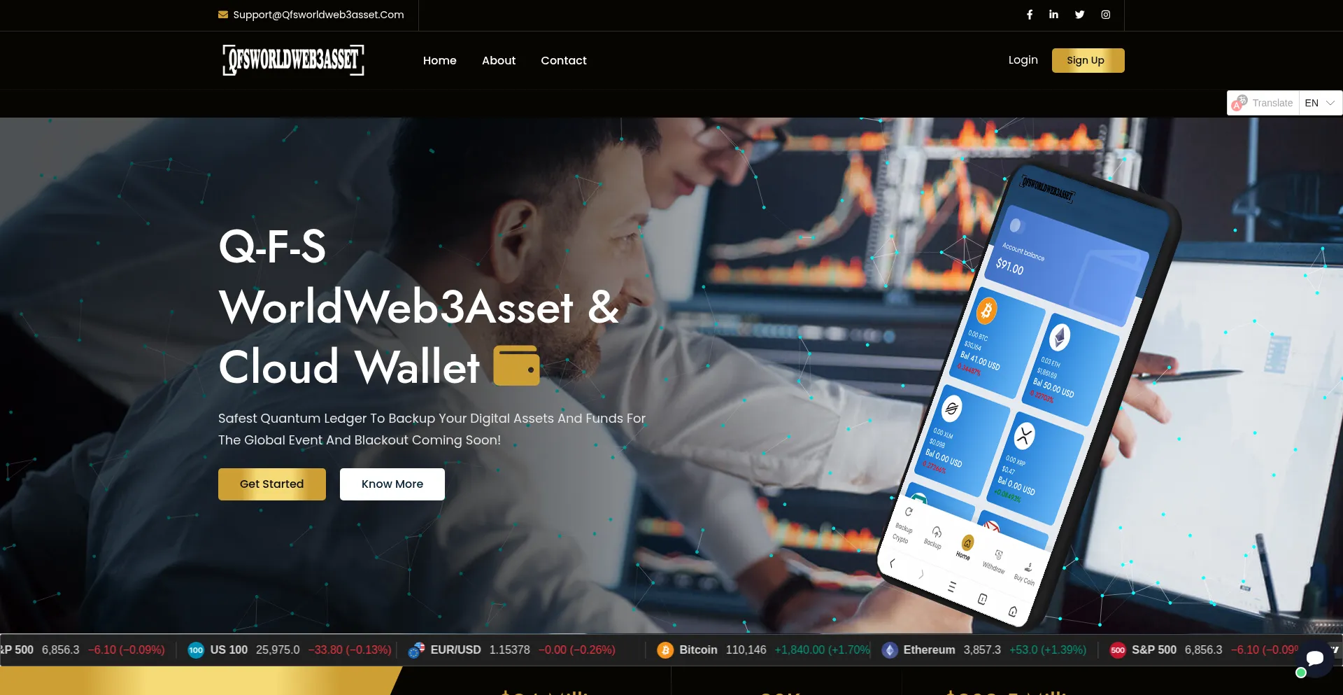 分析显示 qfsworldweb3asset.com 显示社交媒体图标或链接,但不连接到合法的社交媒体档案。这种欺骗性做法通常用于创造虚假合法性,代表需要立即谨慎的欺诈意图的重要指标。