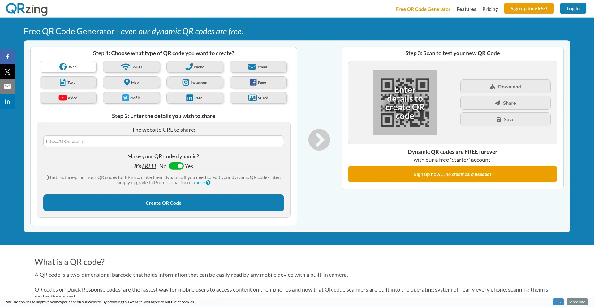 Create unlimited static and dynamic QR codes for FREE with the QRzing QR code generator. Our dynamic QR codes never expire ... ever!