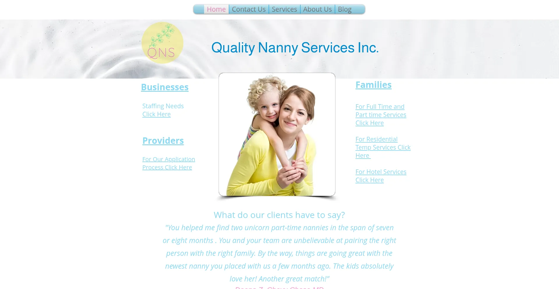 Quality Nanny Services is a premiere, nanny agency and placement service. full time nannies, part time nannies, and temporary nannies.