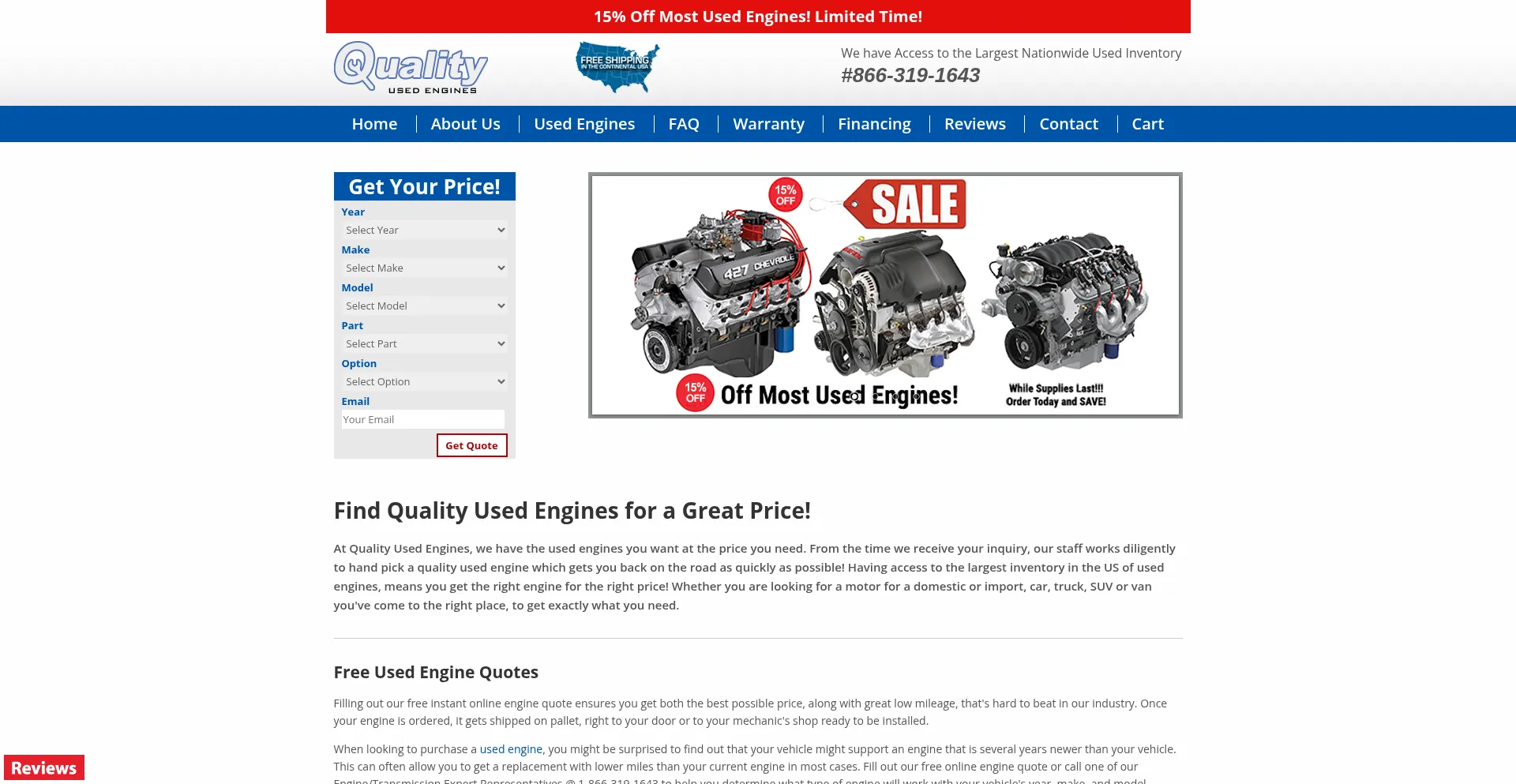 分析表明 qualityusedengines.com 作为电子商务平台运营,促进商品或服务的在线交易。该网站实现了购物车功能、支付处理系统和产品目录功能,这些是商业零售运营的典型特征。
