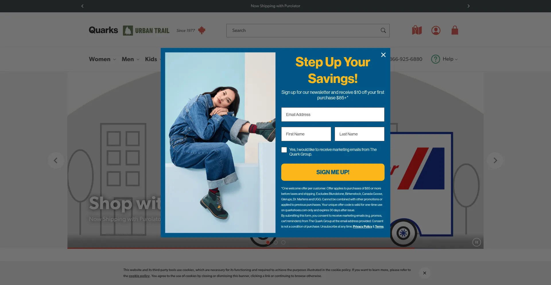 该网站实现符合GDPR或CCPA等隐私法规的cookie同意机制。这表明 quarkshoes.com 遵守数据保护标准并为用户提供对个人数据收集实践的控制。