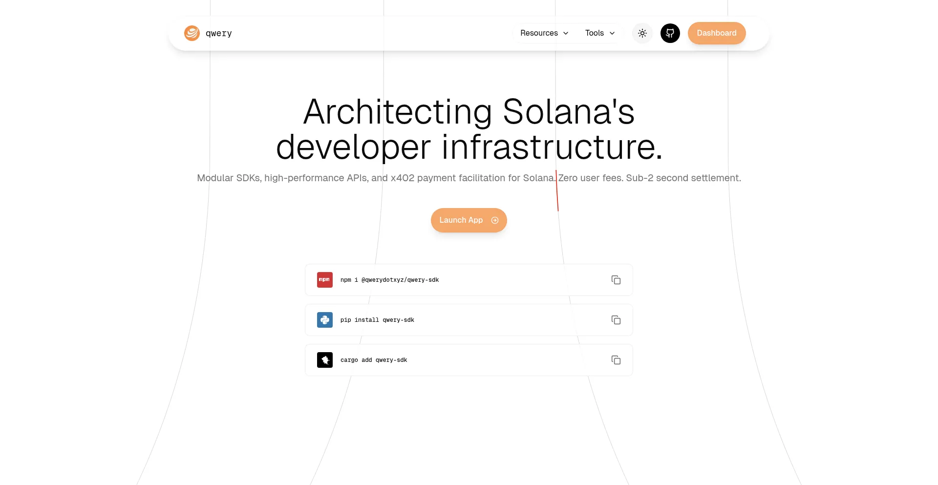 Modular SDKs, high-performance APIs, and x402 payment facilitation for Solana. Zero user fees. Sub-2 second settlement.