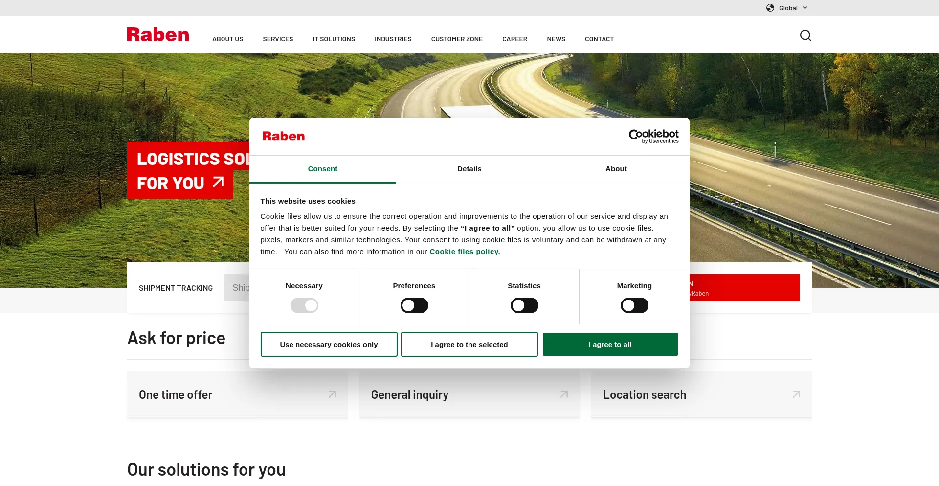 该网站实现符合GDPR或CCPA等隐私法规的cookie同意机制。这表明 raben-group.com 遵守数据保护标准并为用户提供对个人数据收集实践的控制。