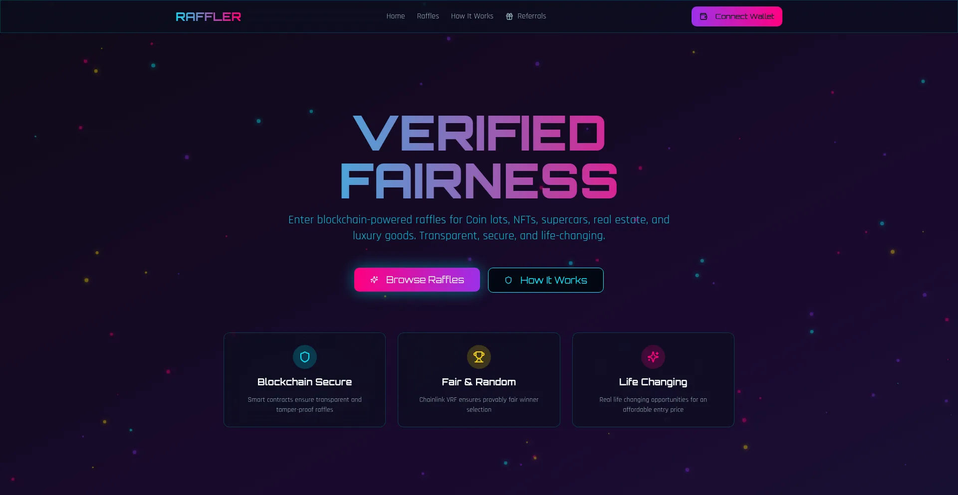 Enter blockchain-powered raffles to win high value items. Provably fair using Chainlink VRF and NFT verification.