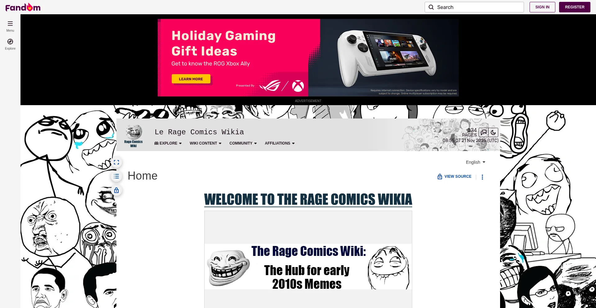 Welcome to the Rage Comic Wikia, the wiki for the late 2000s/early 2010s memes. Of course! We are very thankful for the editors we have now and the more people that we have maki...