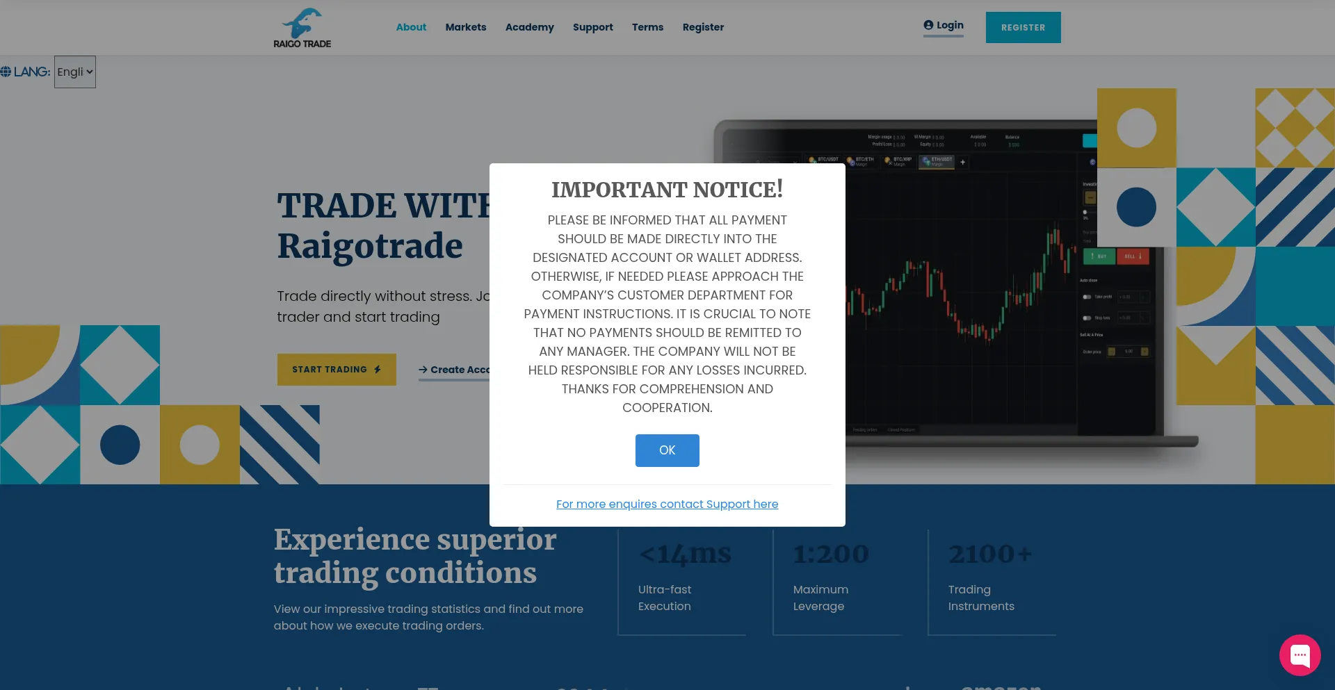 Raigotrade.com 是一个可疑网站,由于几个危险信号使其不可靠。该网站可能包含误导性信息,从事可疑做法,甚至可能托管恶意软件。同时很难确定谁真正运营该网站或如何联系他们。