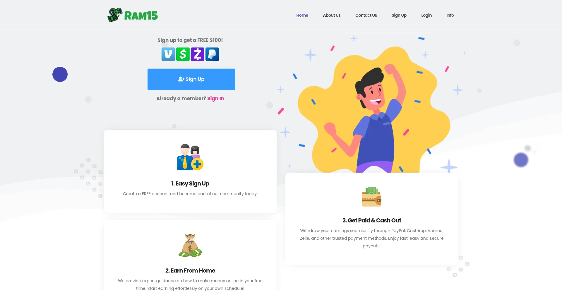 尽管它显示虚假推荐和截图,Ram15.com 遵循快速致富计划的经典模式。它关于轻松被动收入的声明旨在欺骗人们进一步传播诈骗。