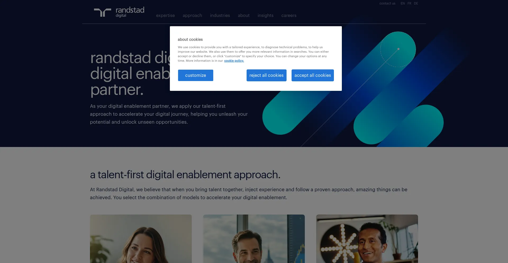 该网站实现符合GDPR或CCPA等隐私法规的cookie同意机制。这表明 randstaddigital.com 遵守数据保护标准并为用户提供对个人数据收集实践的控制。