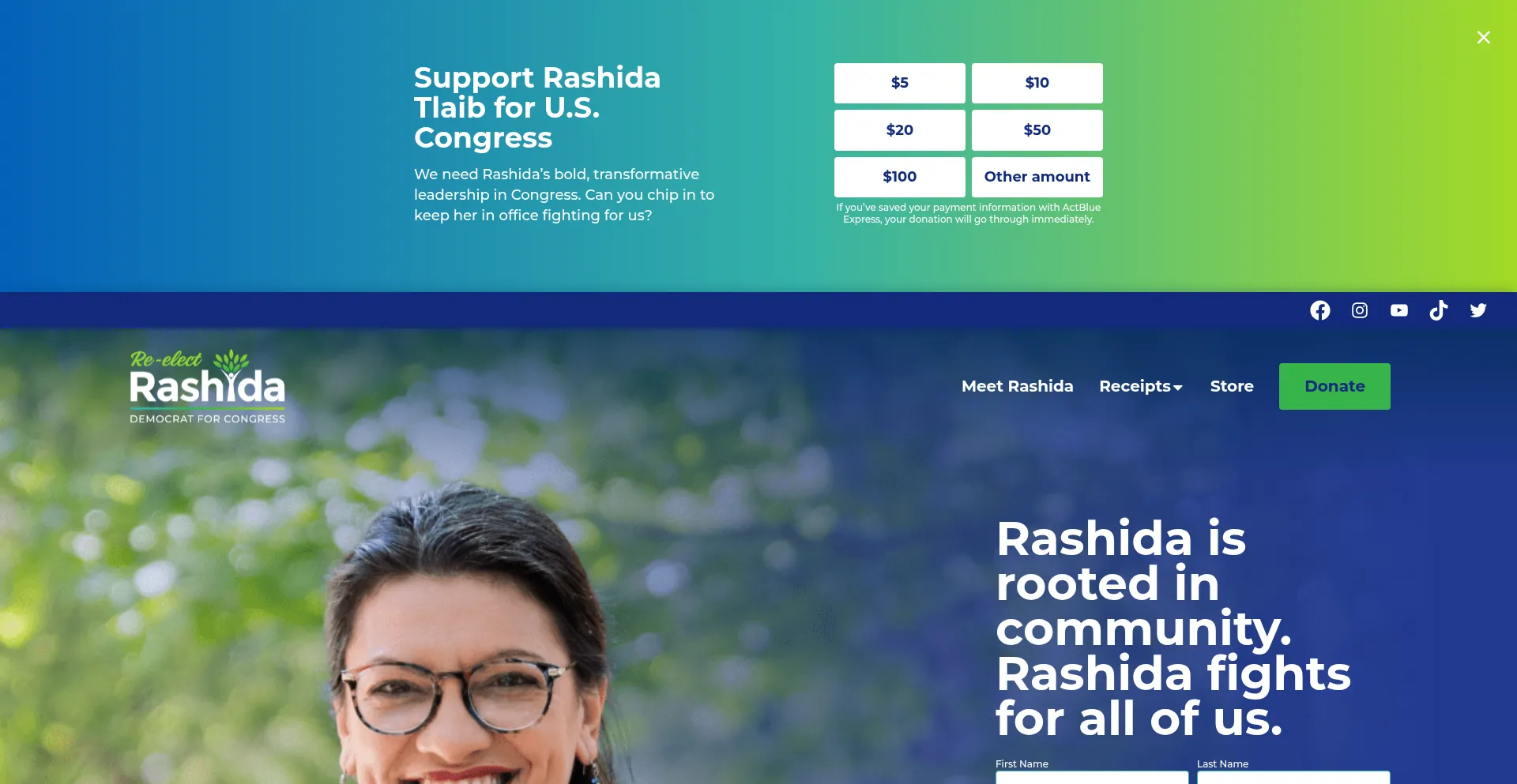 网站上存在社交媒体链接表明 rashidaforcongress.com 在社交媒体上维护官方账户,这是可信度和参与度的积极信号。