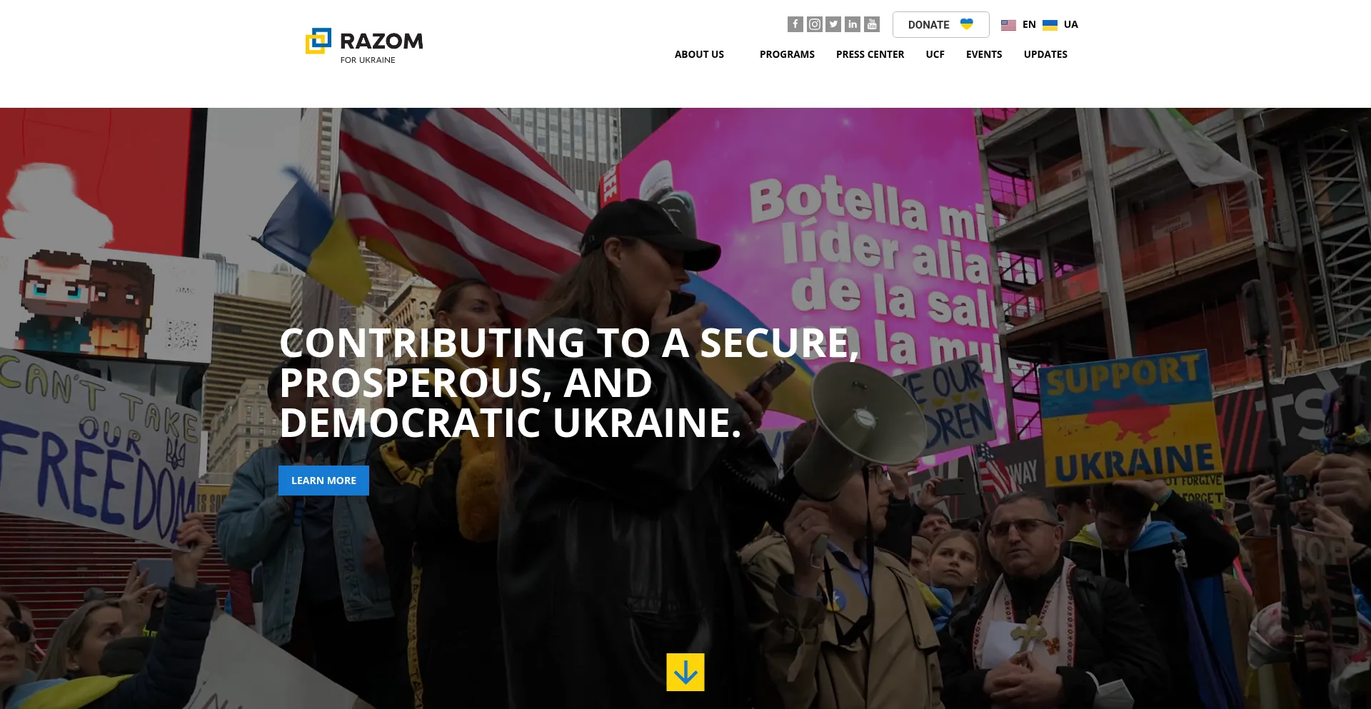 网站上存在社交媒体链接表明 razom.org 在社交媒体上维护官方账户,这是可信度和参与度的积极信号。