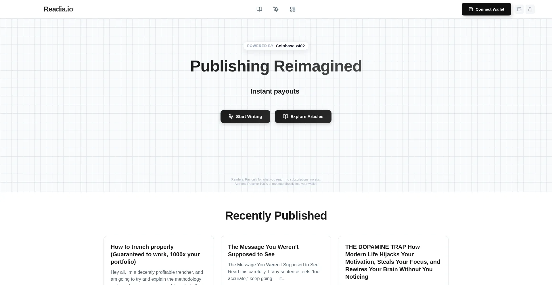 Readia.io - Pay only for the content you read. Writers set prices ($0.01-$1.00) per article, readers pay instantly with crypto.