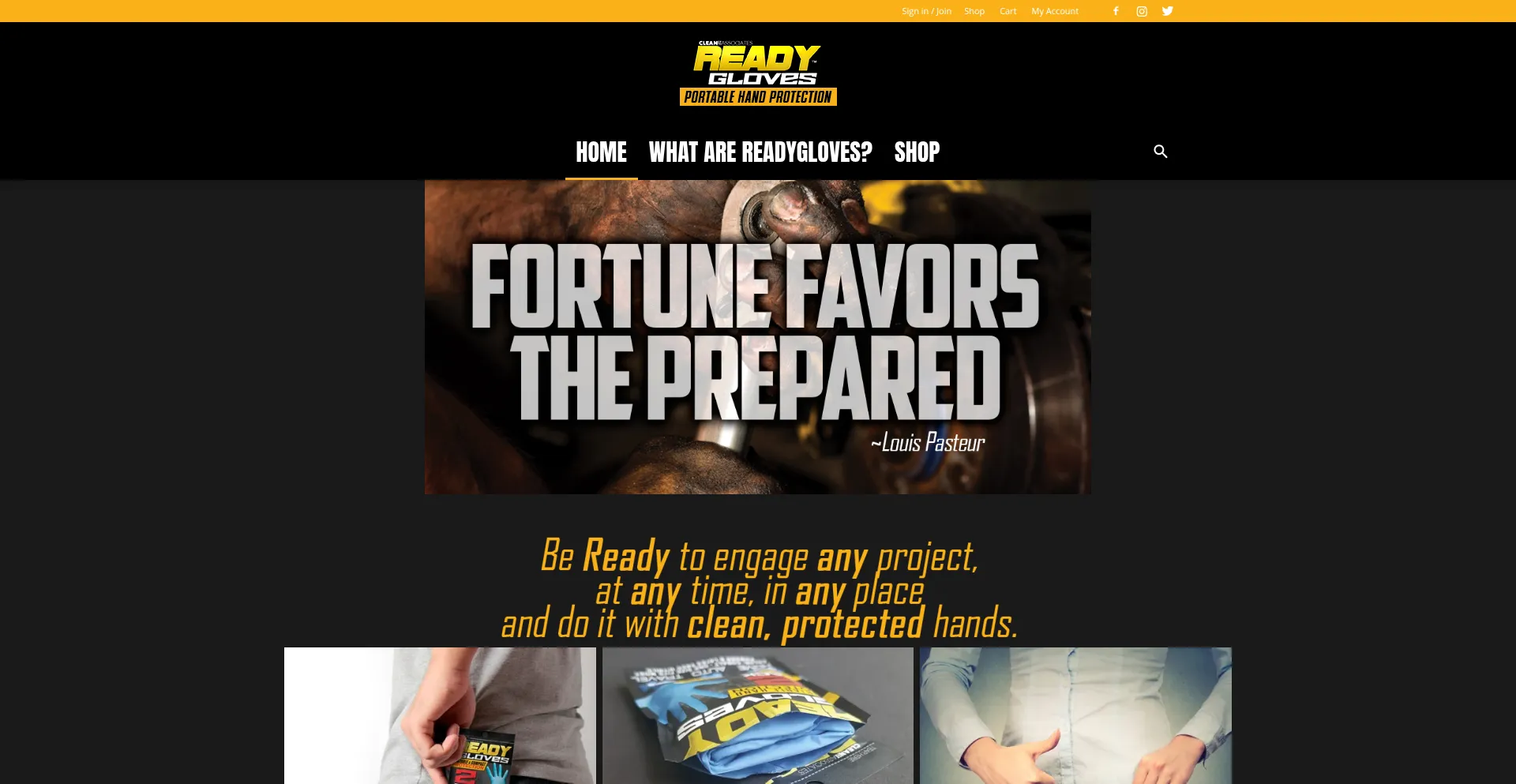 网站 readygloves.com 被配置为一个带有移动应用功能的网络应用。用户可以直接将该网站安装到设备的桌面上,以快速访问并享受类似移动应用的体验。