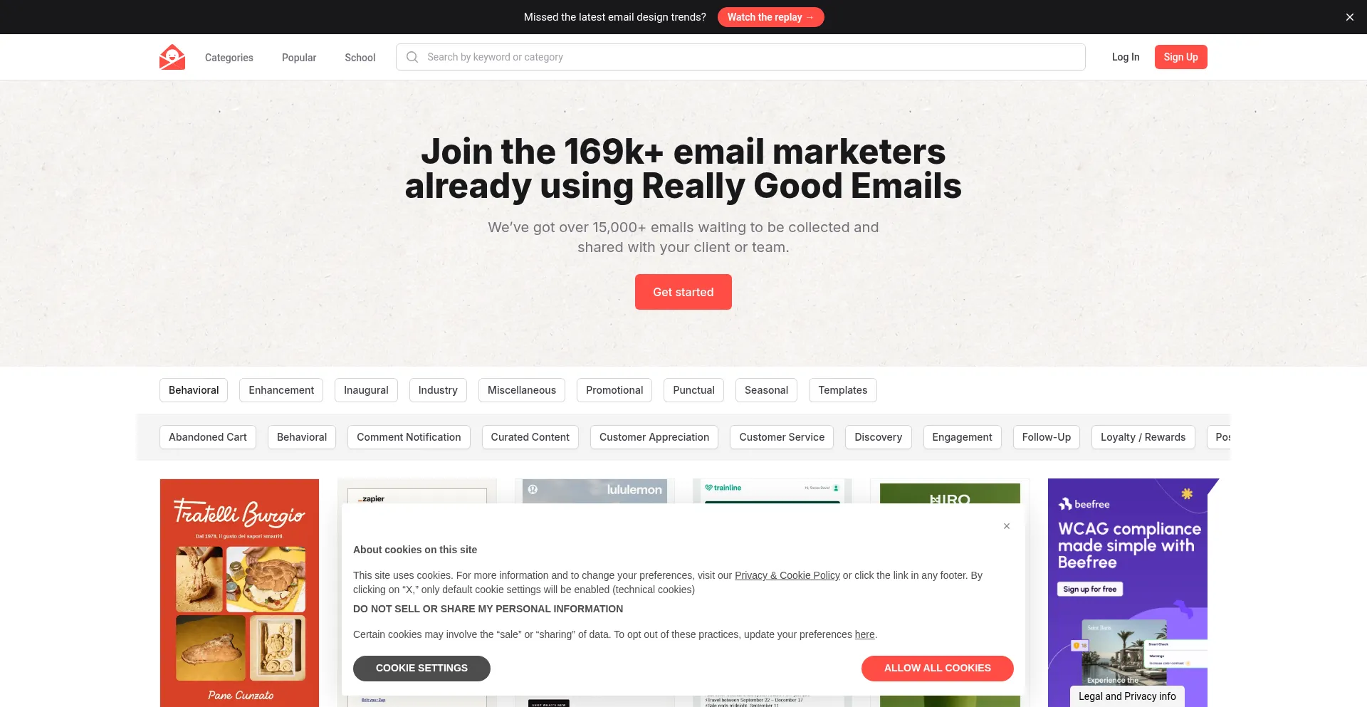 该网站实现符合GDPR或CCPA等隐私法规的cookie同意机制。这表明 reallygoodemails.com 遵守数据保护标准并为用户提供对个人数据收集实践的控制。