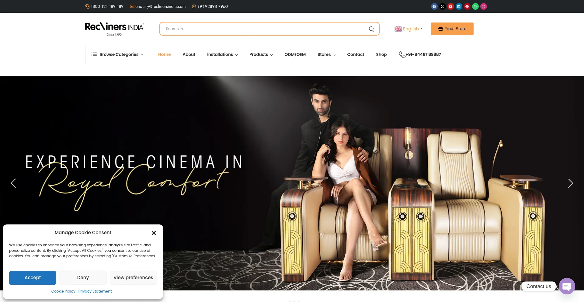 该网站实现符合GDPR或CCPA等隐私法规的cookie同意机制。这表明 reclinersindia.com 遵守数据保护标准并为用户提供对个人数据收集实践的控制。