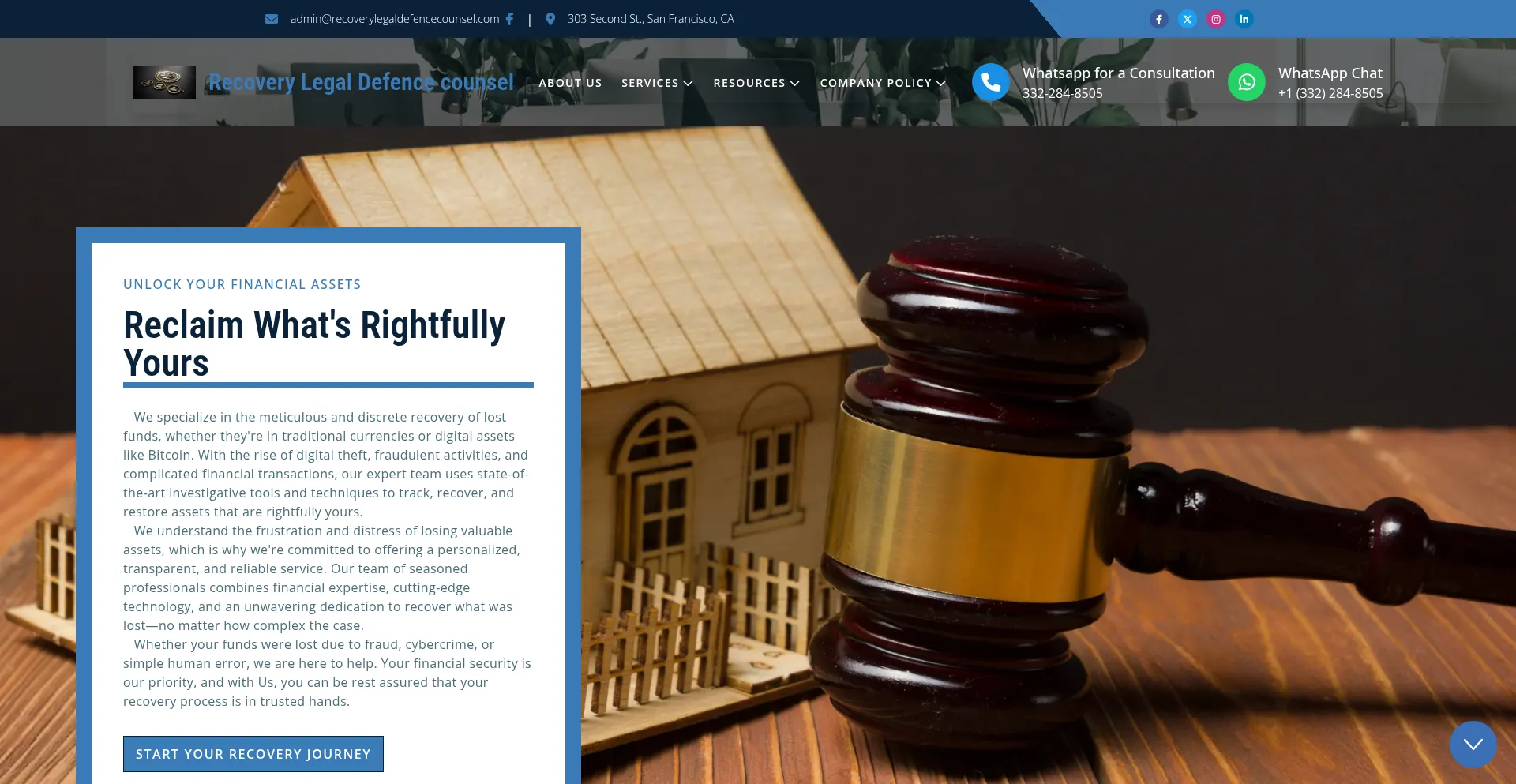 网站 recoverylegaldefencecounsel.com 宣传针对丢失或被盗资产的资金恢复服务。虽然一些在应急费用结构上运营,其他可能需要预付款,这可能表明欺诈运营。在聘请此类服务前验证凭据和监管合规性。