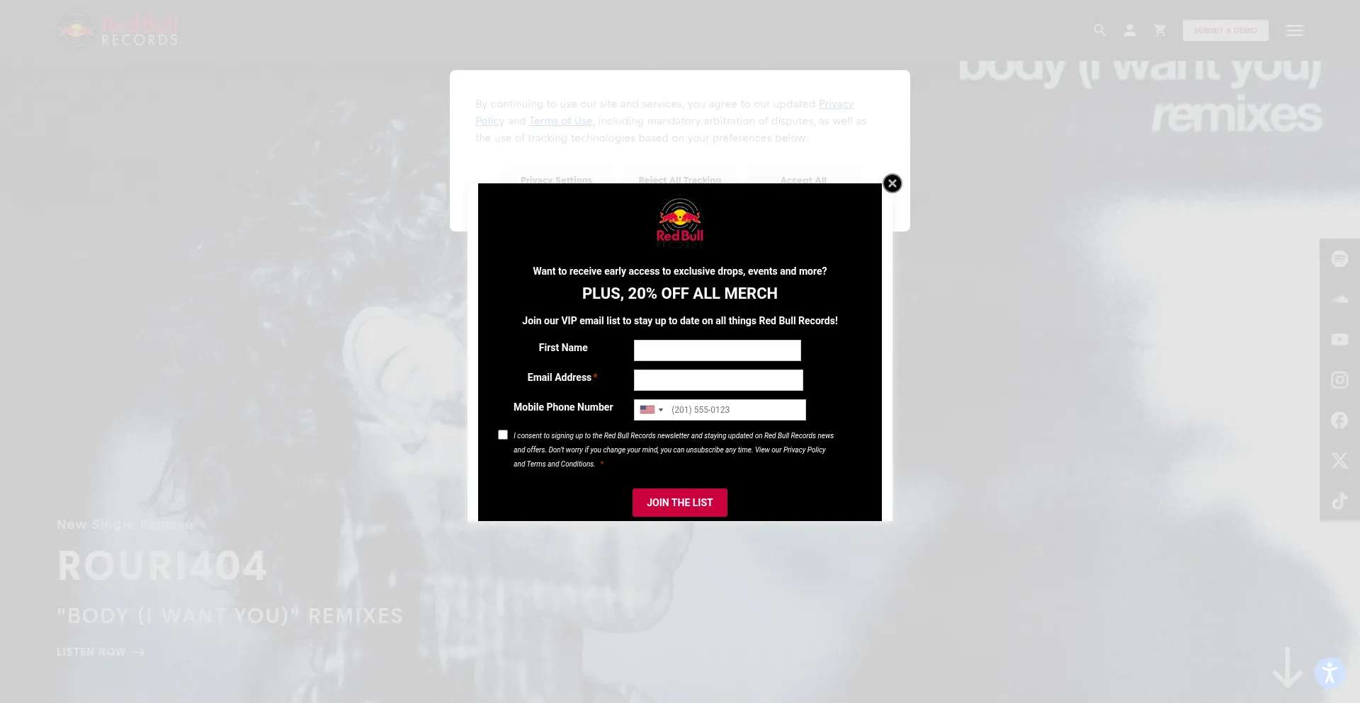 该网站实现数据收集表单,请求个人信息,包括姓名、电子邮件地址、电话号码或其他敏感详细信息。用户应验证 redbullrecords.com 的合法性并在提交个人数据前查看隐私政策。