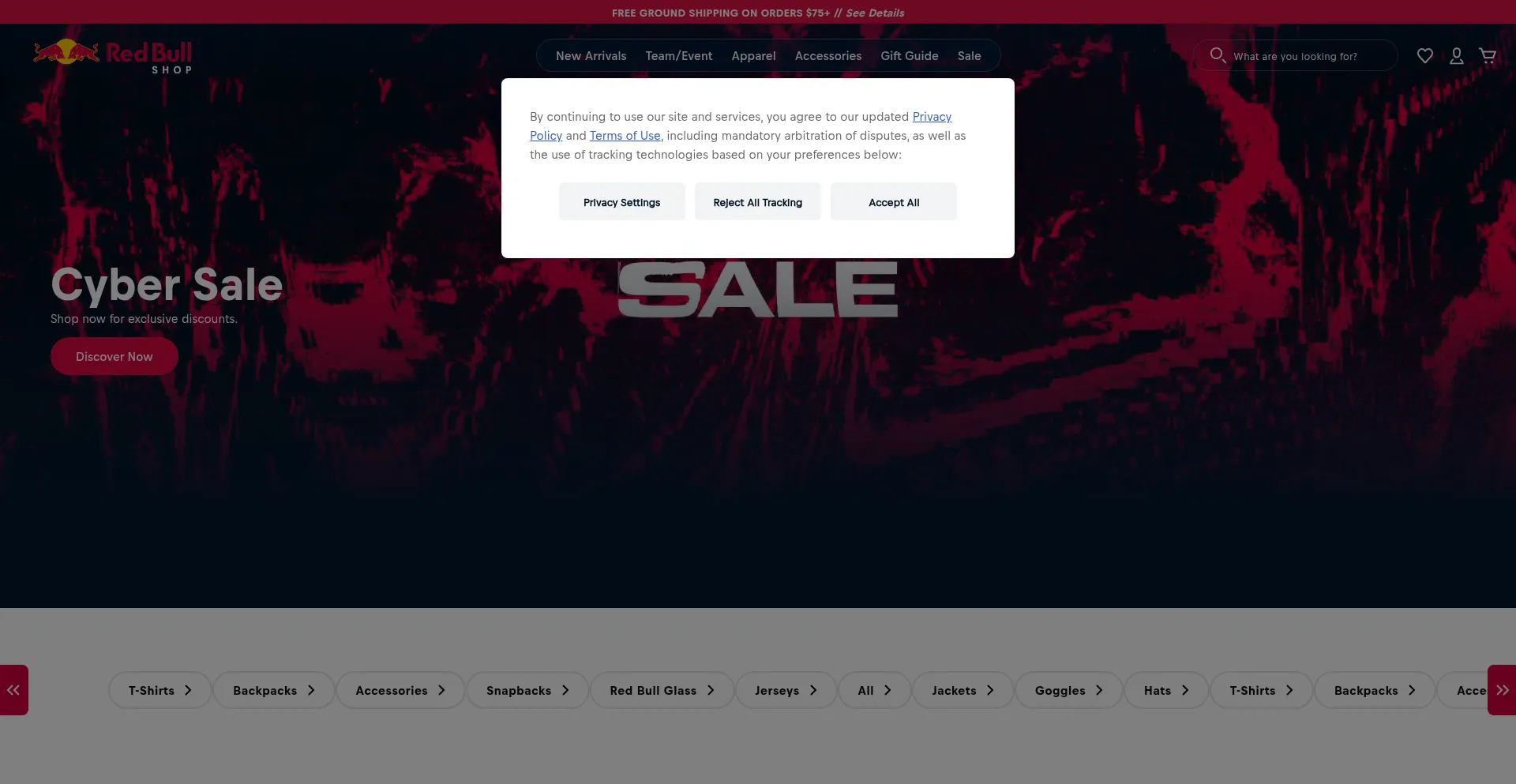 该网站实现符合GDPR或CCPA等隐私法规的cookie同意机制。这表明 redbullshopus.com 遵守数据保护标准并为用户提供对个人数据收集实践的控制。