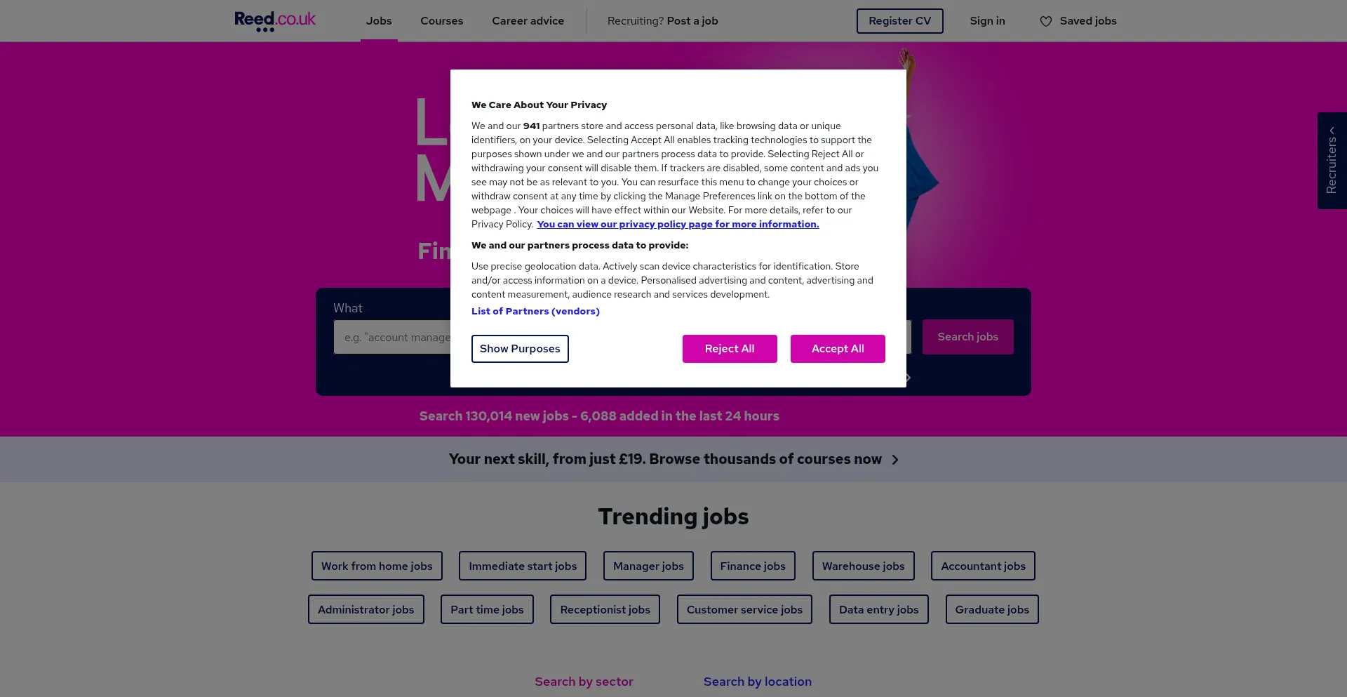 该网站实现符合GDPR或CCPA等隐私法规的cookie同意机制。这表明 reed.co.uk 遵守数据保护标准并为用户提供对个人数据收集实践的控制。