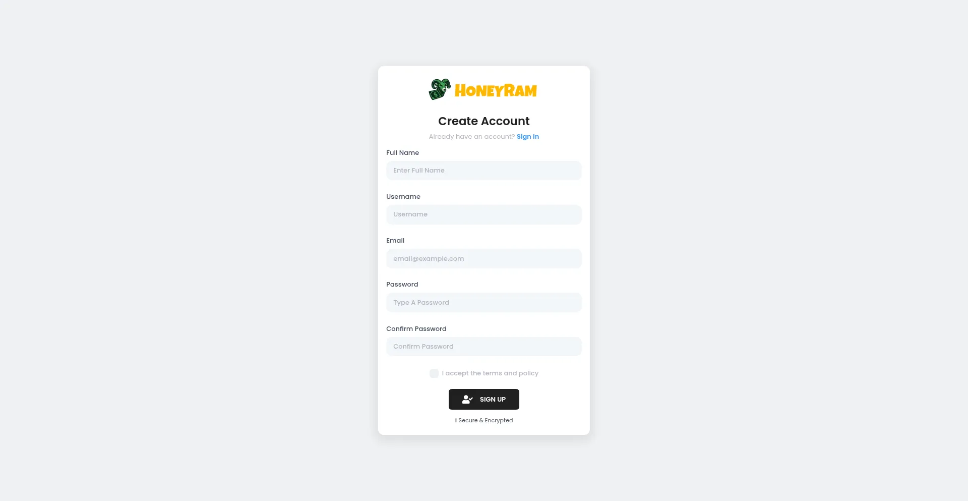 该网站实现数据收集表单,请求个人信息,包括姓名、电子邮件地址、电话号码或其他敏感详细信息。用户应验证 ref.honeyram.com 的合法性并在提交个人数据前查看隐私政策。