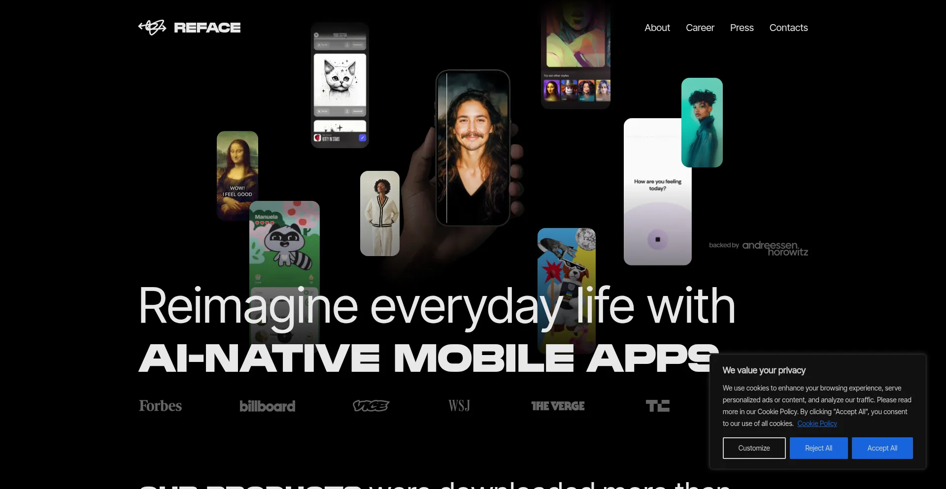 该网站实现符合GDPR或CCPA等隐私法规的cookie同意机制。这表明 reface.ai 遵守数据保护标准并为用户提供对个人数据收集实践的控制。