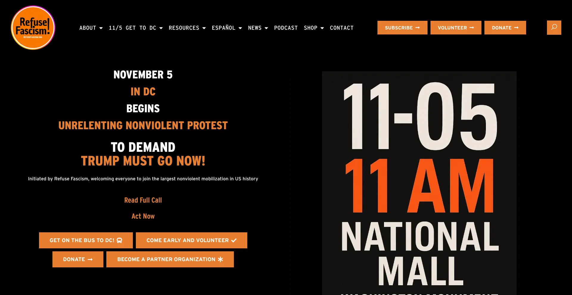 November 5in DC beginsunrelenting nonviolent protest to demand Trump must go now! Initiated by Refuse Fascism, welcoming everyone to join the largest nonviolent mobilization in ...
