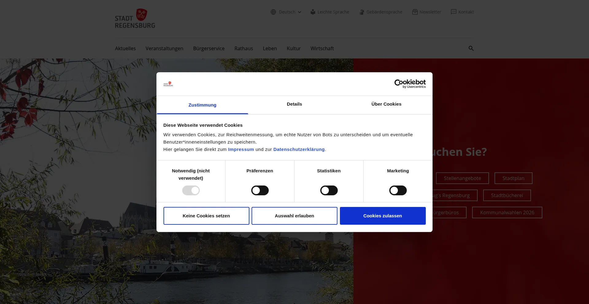 该网站实现符合GDPR或CCPA等隐私法规的cookie同意机制。这表明 regensburg.de 遵守数据保护标准并为用户提供对个人数据收集实践的控制。