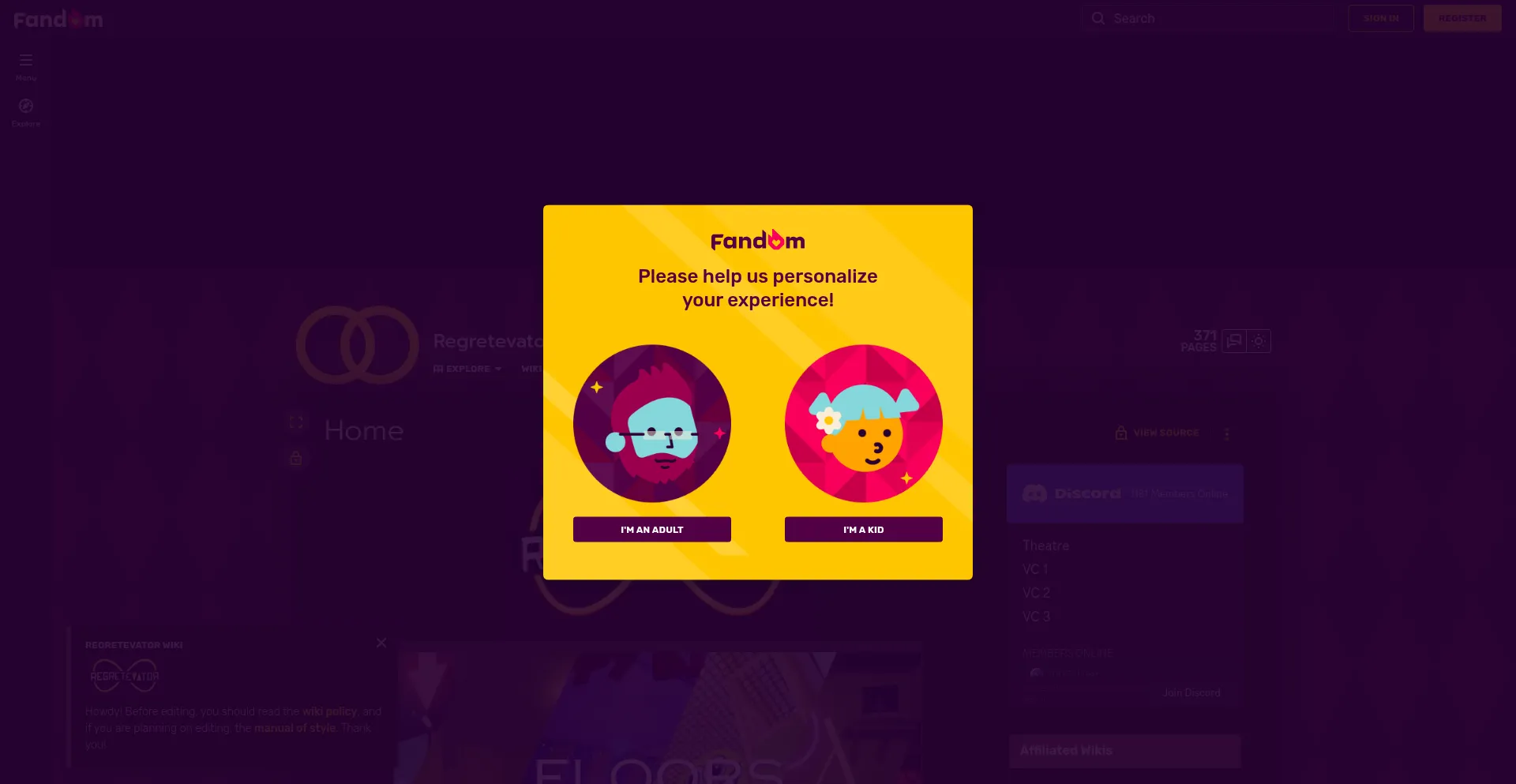 该网站实现符合GDPR或CCPA等隐私法规的cookie同意机制。这表明 regretevator.fandom.com 遵守数据保护标准并为用户提供对个人数据收集实践的控制。