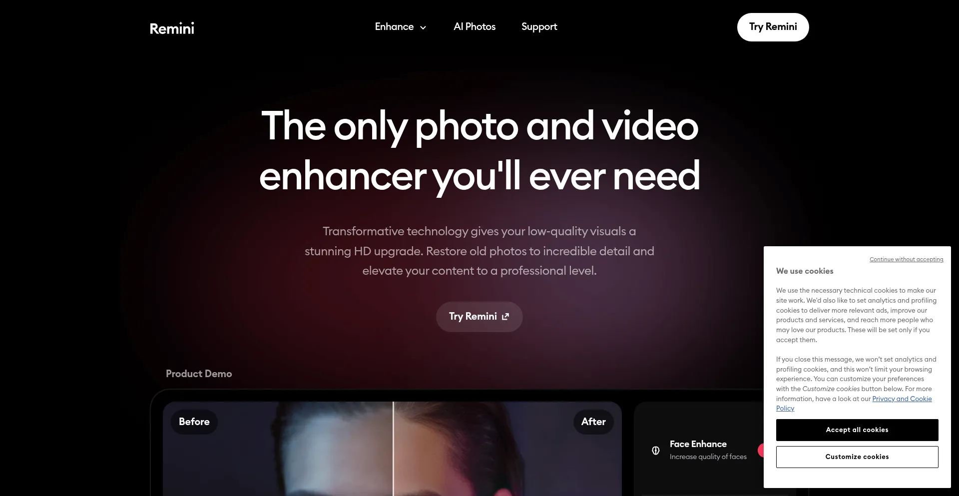 该网站实现符合GDPR或CCPA等隐私法规的cookie同意机制。这表明 remini.ai 遵守数据保护标准并为用户提供对个人数据收集实践的控制。