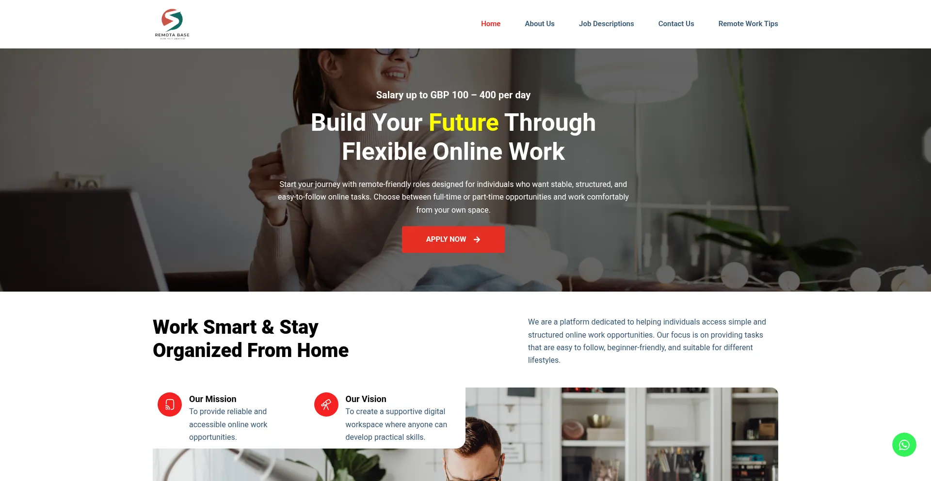 该网站实现数据收集表单,请求个人信息,包括姓名、电子邮件地址、电话号码或其他敏感详细信息。用户应验证 remota-base.com 的合法性并在提交个人数据前查看隐私政策。