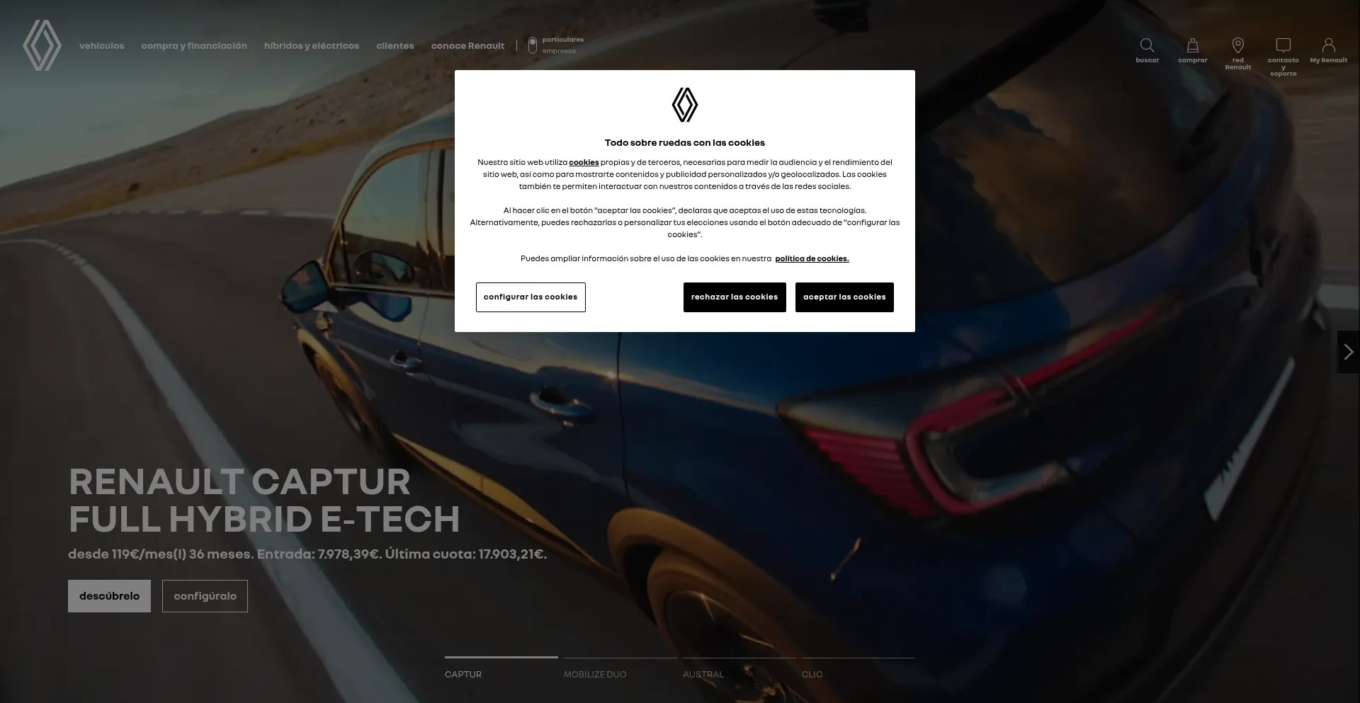 Bienvenido a Renault España. Descubre nuestra gama de coches: turismos (Clio,...), híbridos (Captur...), eléctricos (Megane...) y comerciales.
