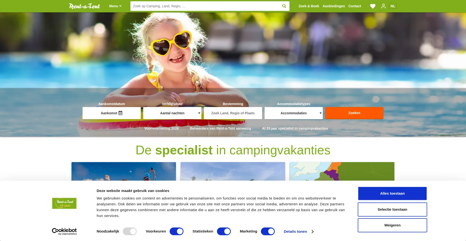 Huur een ingerichte tent of luxe stacaravan. Boek online een vakantie op onze campings in de Benelux, Frankrijk, Spanje, Italie, Slovenie of Oostenrijk.