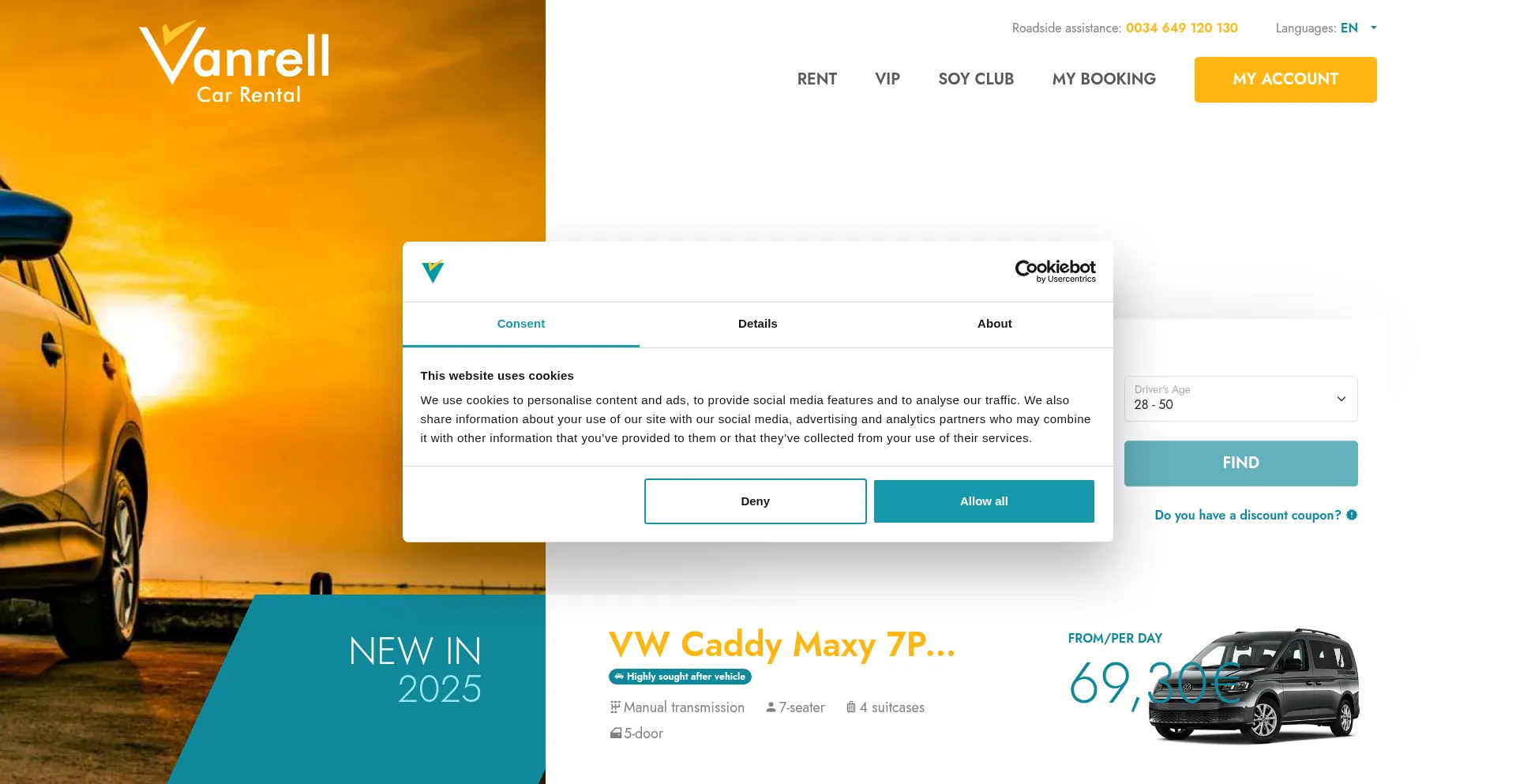 该网站实现符合GDPR或CCPA等隐私法规的cookie同意机制。这表明 rentacarvanrell.com 遵守数据保护标准并为用户提供对个人数据收集实践的控制。