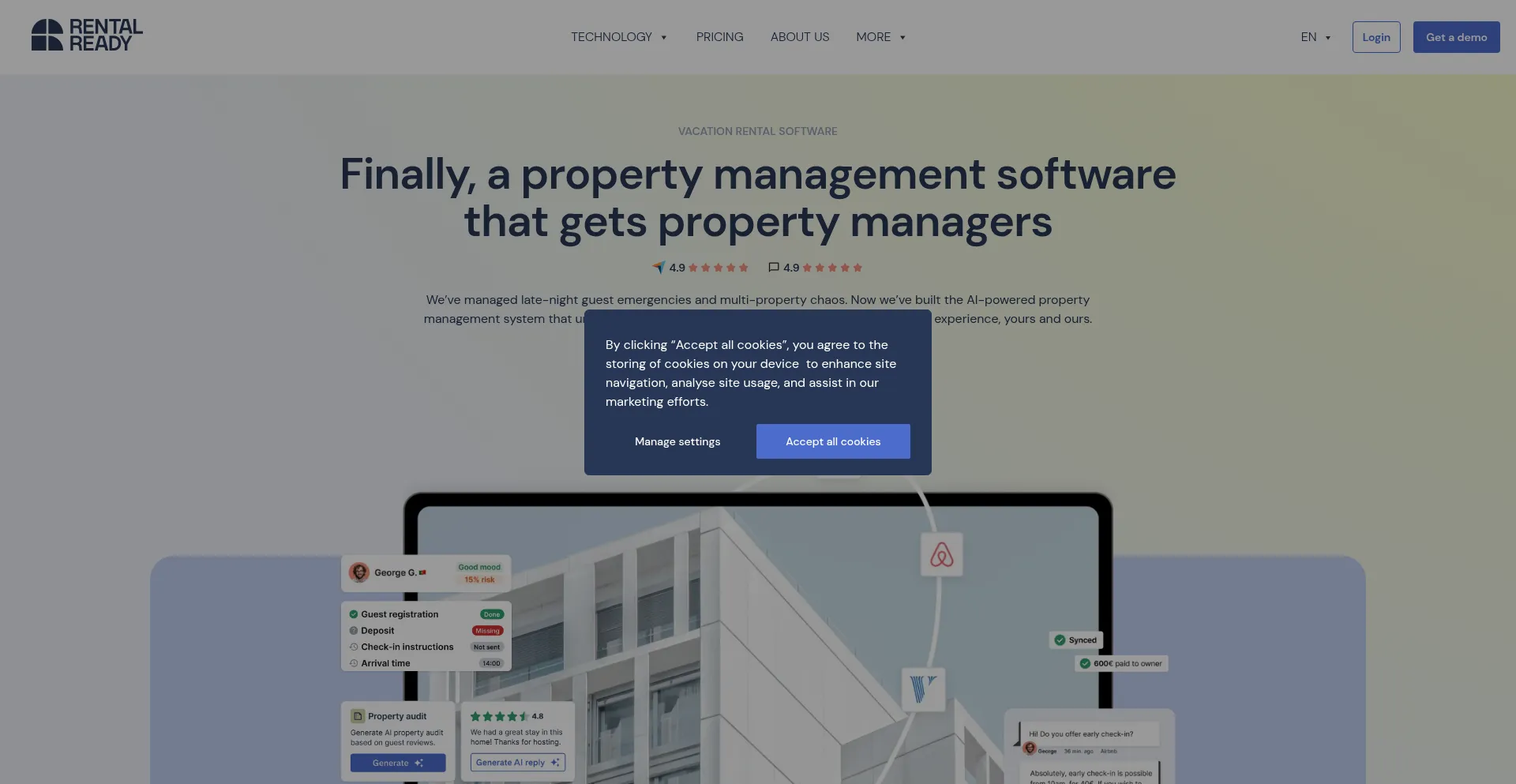 该网站实现符合GDPR或CCPA等隐私法规的cookie同意机制。这表明 rentalready.io 遵守数据保护标准并为用户提供对个人数据收集实践的控制。