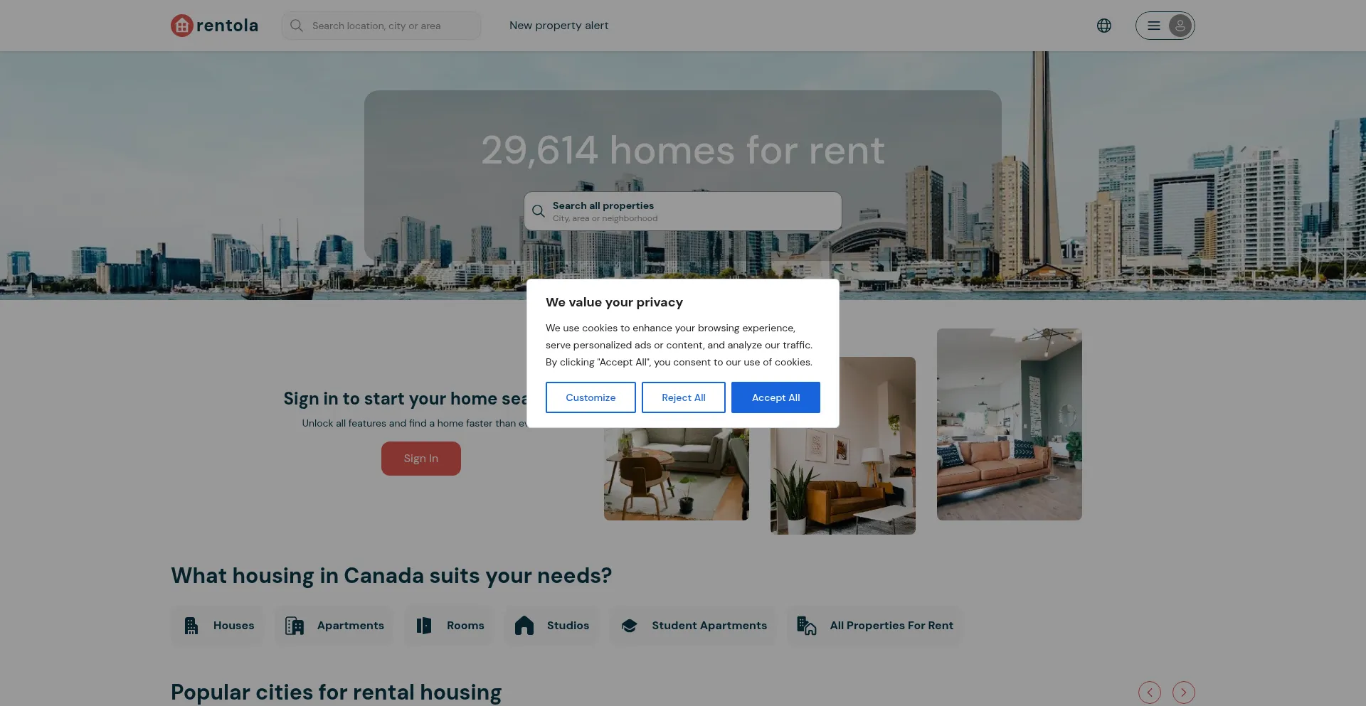 该网站实现符合GDPR或CCPA等隐私法规的cookie同意机制。这表明 rentola.ca 遵守数据保护标准并为用户提供对个人数据收集实践的控制。