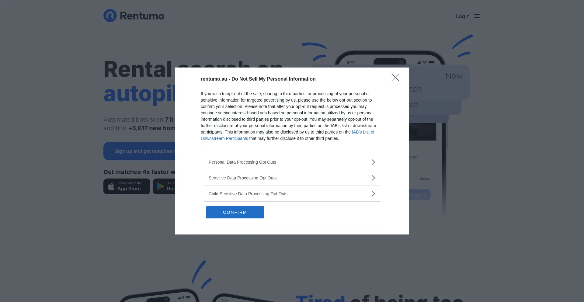 rentumo.au 拥有可用的 iOS 移动应用程序,表明为 Apple 设备用户提供跨平台可访问性。