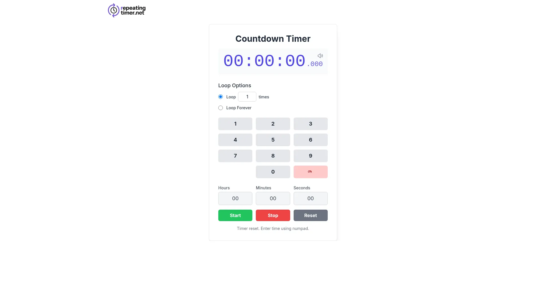 A simple online repeating timer. Set any time and have it loop or repeat for a custom number of times. Perfect for study, workouts, and meetings. Free, no signup needed.