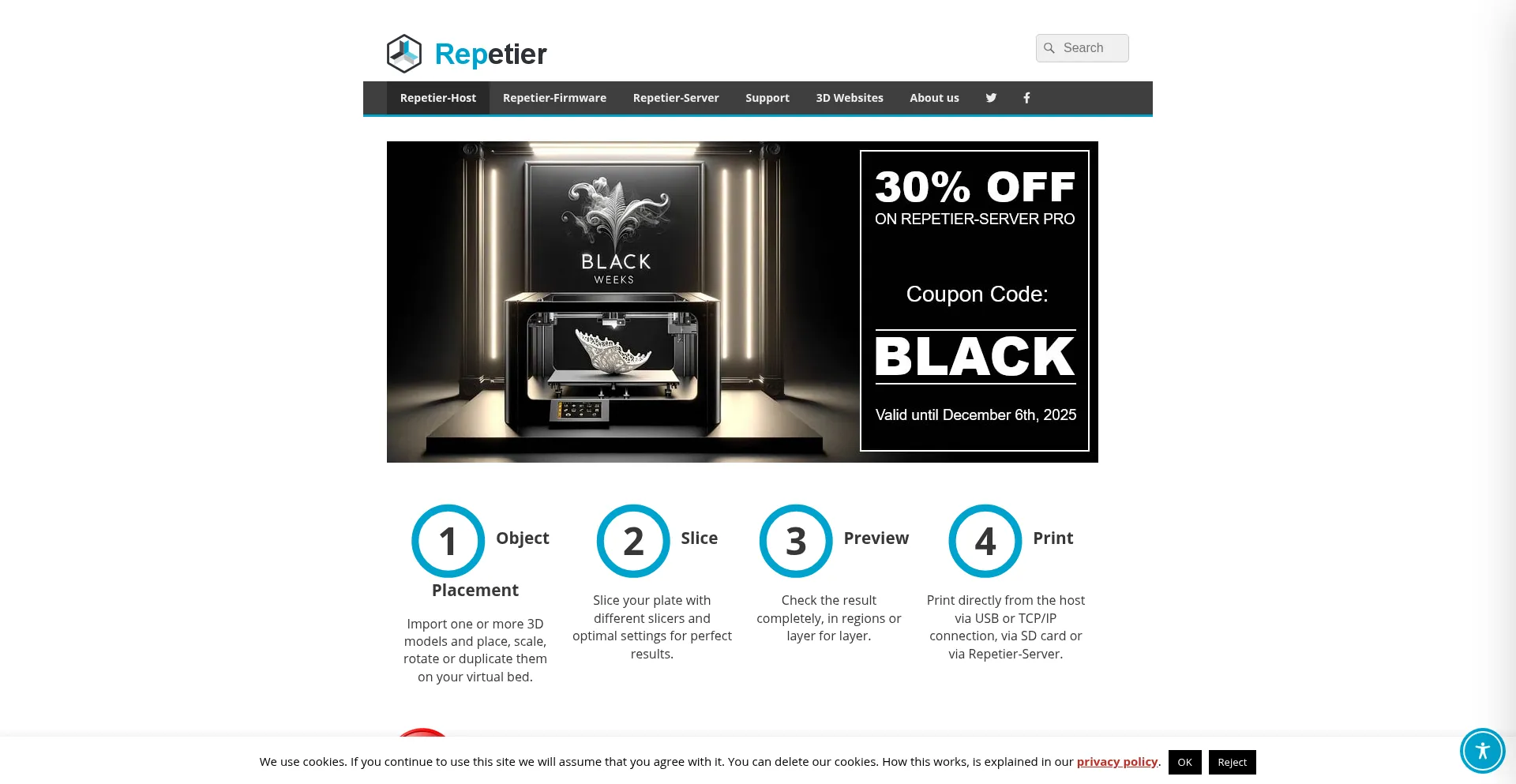 该网站实现符合GDPR或CCPA等隐私法规的cookie同意机制。这表明 repetier.com 遵守数据保护标准并为用户提供对个人数据收集实践的控制。