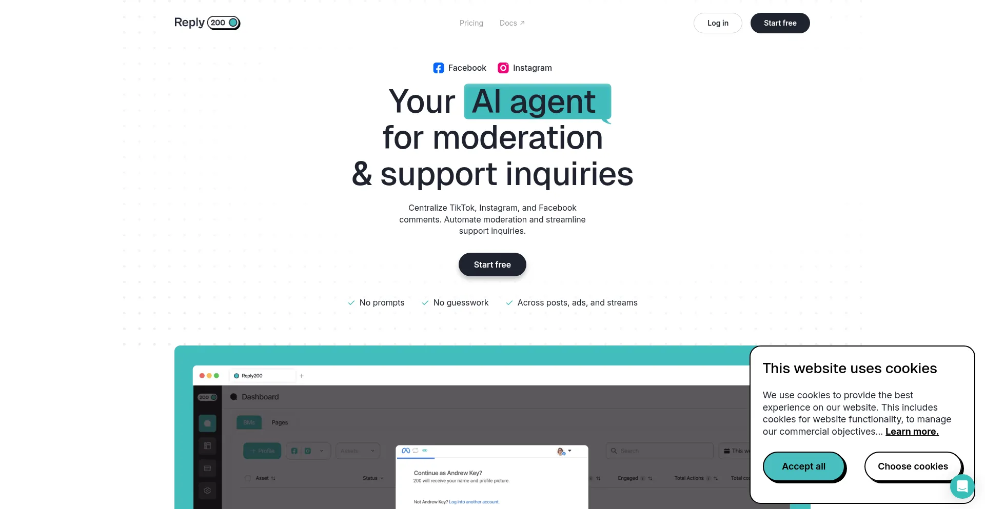 Reply200 — AI agent for moderation & support on TikTok, Instagram & Facebook