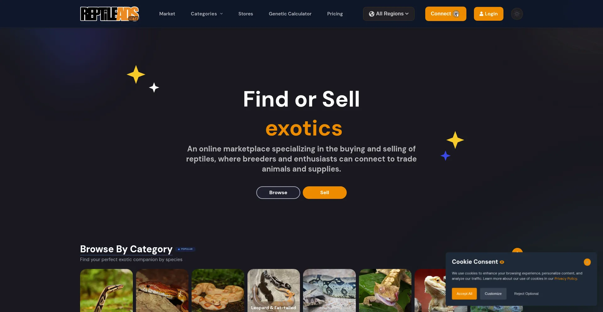 Buy and sell reptiles, amphibians, spiders and other exotic animals worldwide with ReptileAds. Reach keepers and breeders across the globe with our advanced marketplace features.