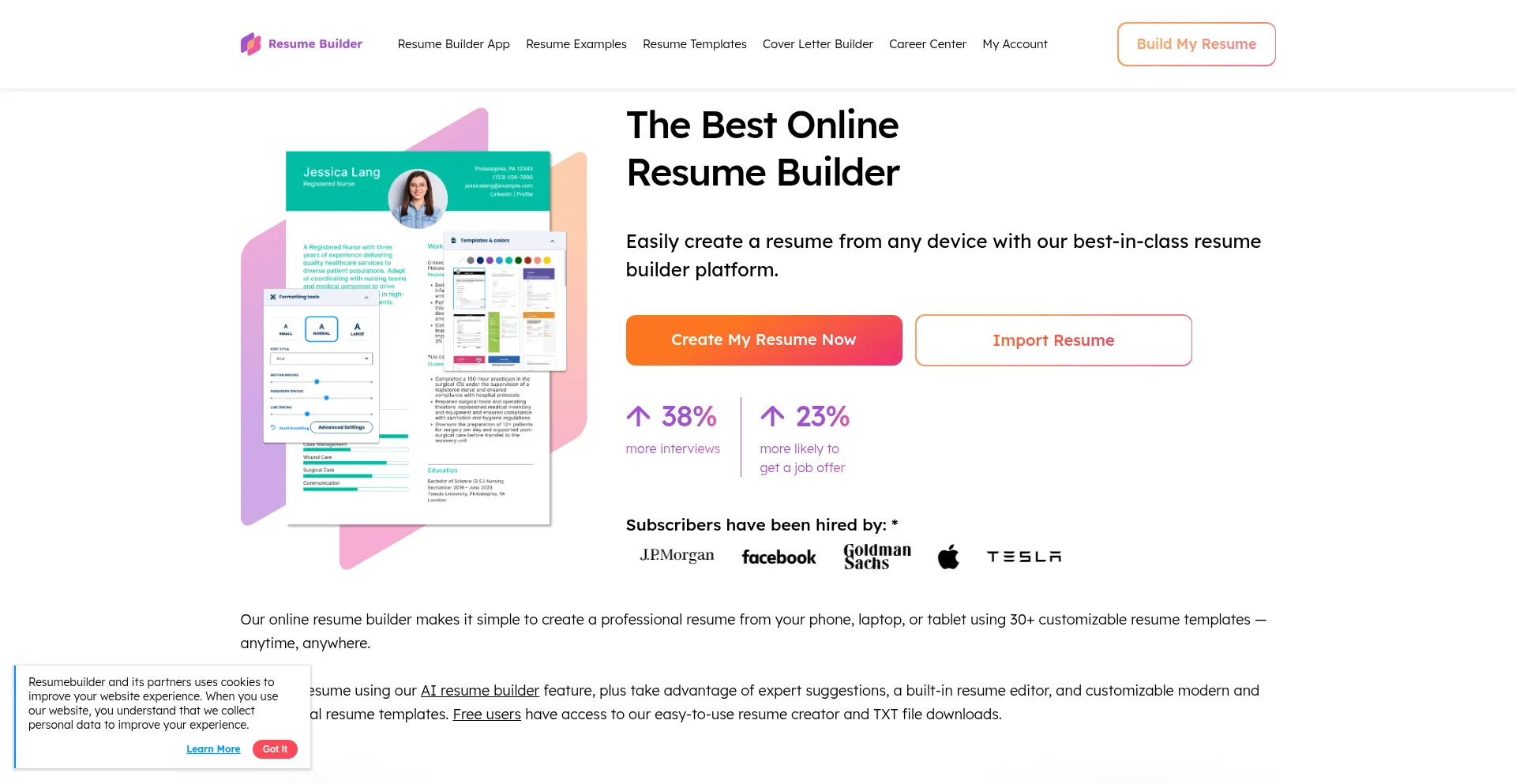 该网站实现符合GDPR或CCPA等隐私法规的cookie同意机制。这表明 resumebuilder.com 遵守数据保护标准并为用户提供对个人数据收集实践的控制。