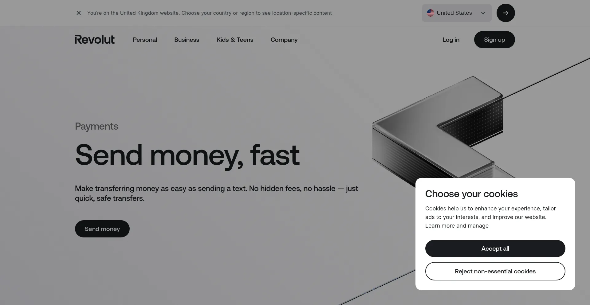 该网站实现符合GDPR或CCPA等隐私法规的cookie同意机制。这表明 revolut.me 遵守数据保护标准并为用户提供对个人数据收集实践的控制。