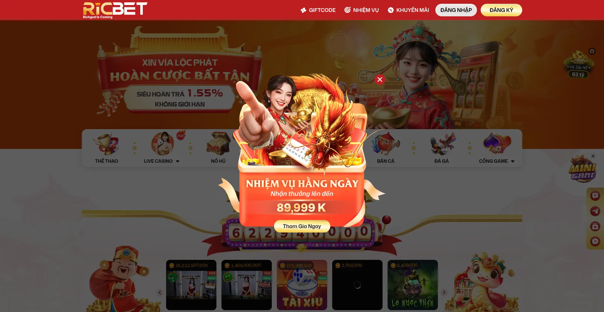 Ricbet - nhà cái cá cược uy tín số 1 thị trường Việt Nam, cung cấp hơn +1000 trò chơi hấp dẫn gồm thể thao, casino, nổ hũ, xổ số, đá gà......