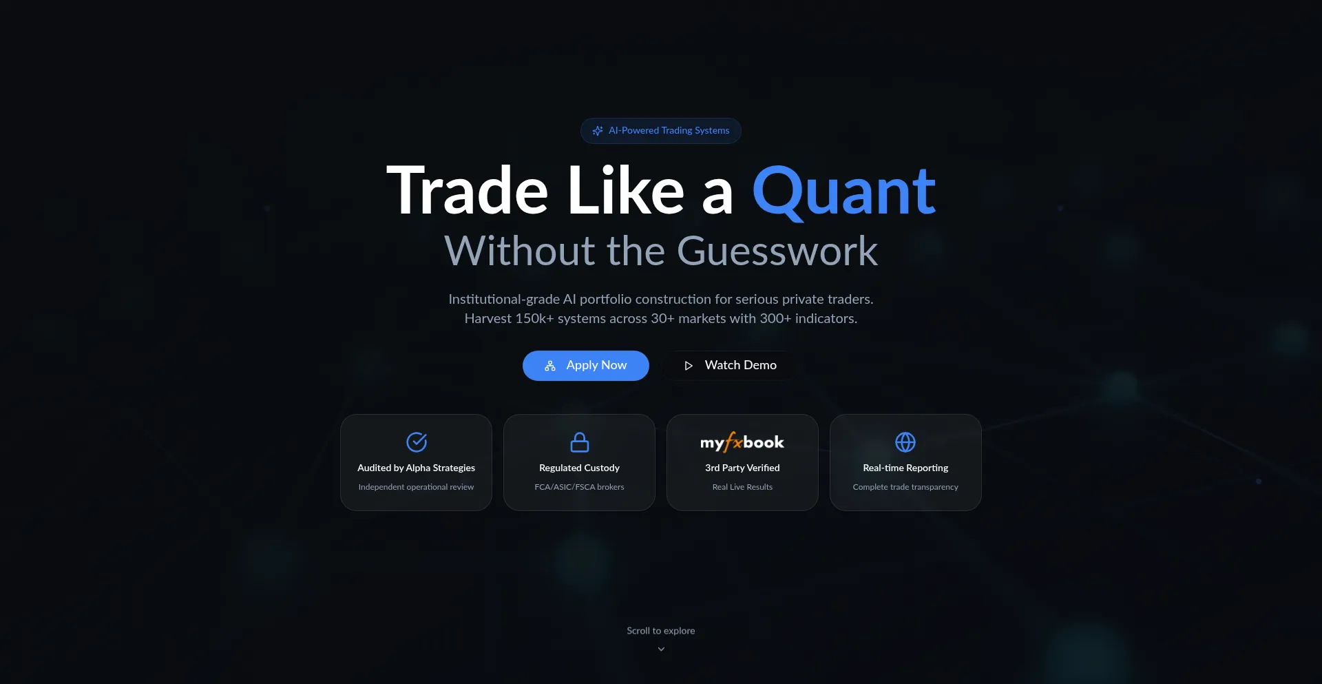 Institutional-grade AI portfolio construction for serious private traders. Harvest 150k+ systems across 30+ markets with 300+ indicators.