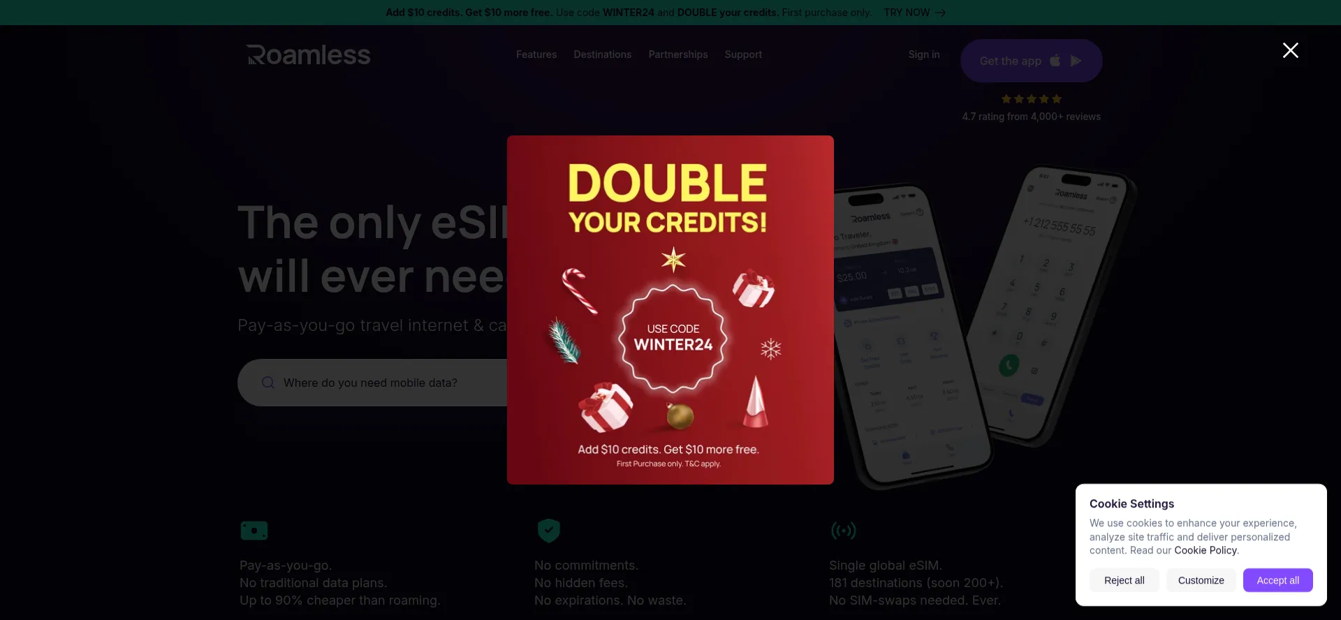 Buy travel eSIM with internet and phone calls in 200+ destinations from Roamless eSIM App. Choose prepaid eSIM plans or pay as you go for your international travels.