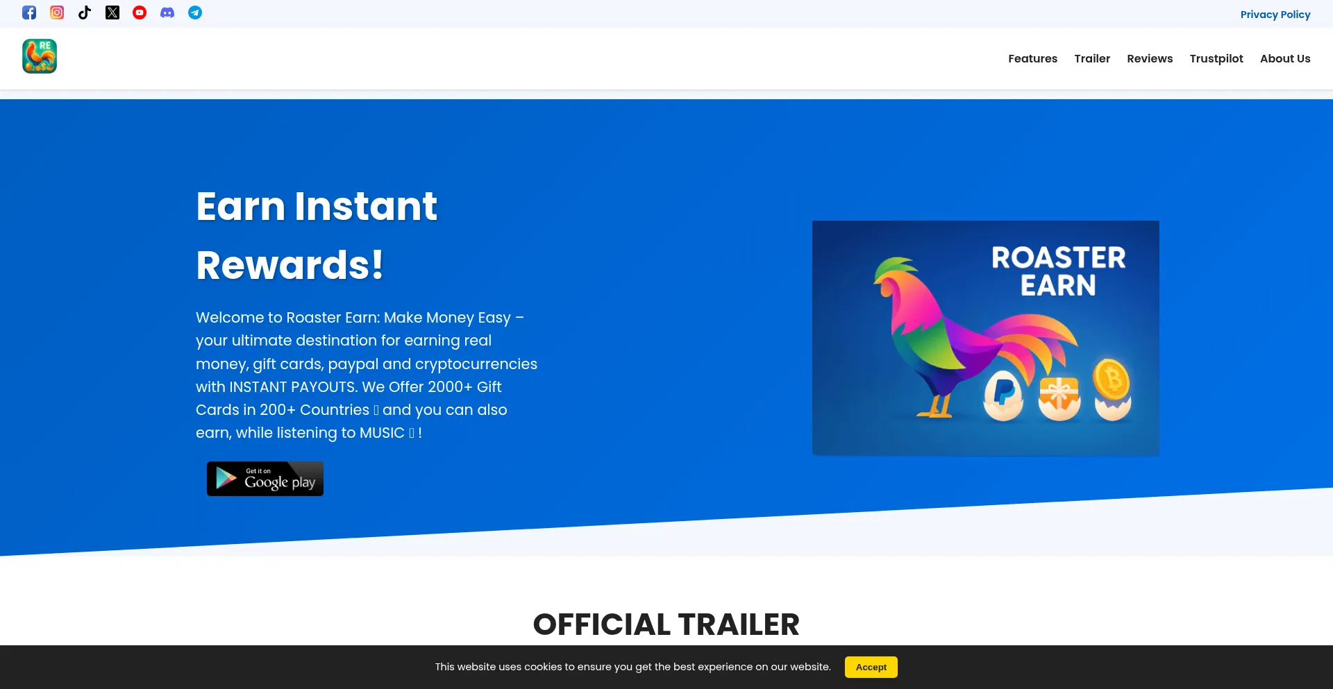 网站上存在社交媒体链接表明 roasterearn.website 在社交媒体上维护官方账户,这是可信度和参与度的积极信号。