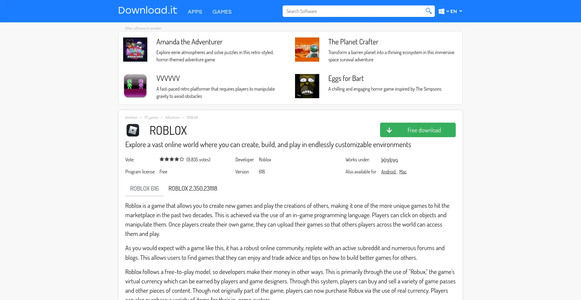 Download ROBLOX 616. Explore a vast online world where you can create, build, and play in endlessly customizable environments.