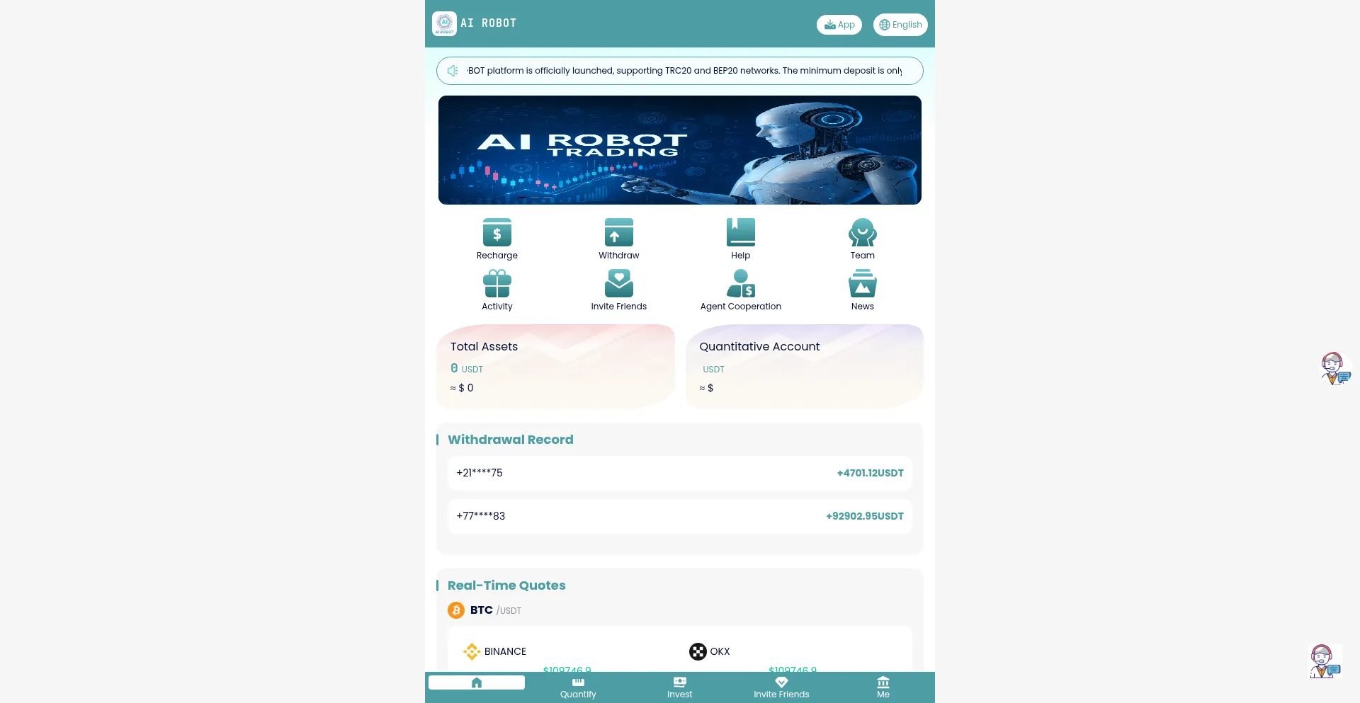 The AI ROBOT platform is officially launched, supporting TRC20 and BEP20 networks.